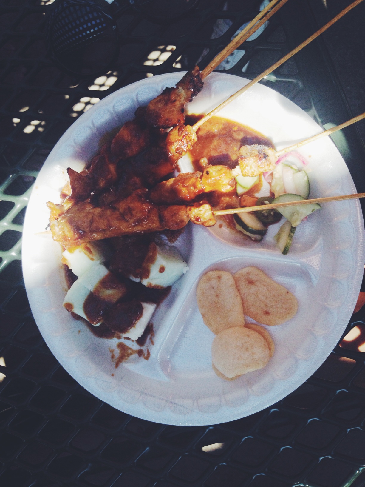 Dengan $8 kami bisa mengobati rasa kangen  makanan Indonesia dengan menyantap  5 tusuk sate, lontong, acar, dan kerupuk. Pengunjung yang membawa anak juga bisa mendaftar untuk lomba makan kerupuk dan lompat karung ala 17-an.